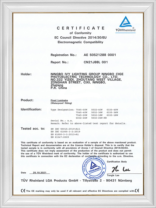 The new working area of Ningbo Cige is equipped with the full production line for luminaries: design, R&D, injection, extrusion, stamping, SMT, LED driver, lighting components, assemble, aging line and packing, etc. With this equipment, Ningbo Cige has obtained the capacity to produce 3.5 million sets of lighting fixtures. Ningbo Cige has passed some certifications, such as CE, ROHS, REACH, and ERP, and provides products and services in strict accordance with ISO9001 and CE standards.